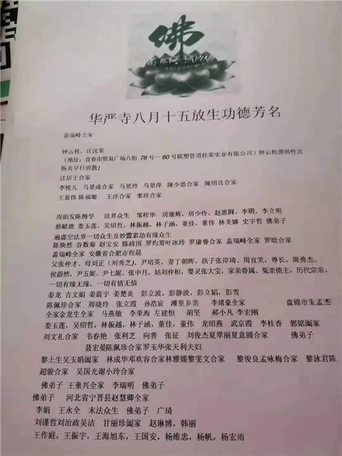 2020年10月1日(农历八月十五日)中秋佳节暨月光菩萨圣诞日,华严寺举办祈福供灯放生法会。祈愿世界和平,国家兴盛,风调雨顺,正法久住,佛日增辉。愿蒙佛光加被,点亮法身慧命的火炬,照亮众生本有的佛性。