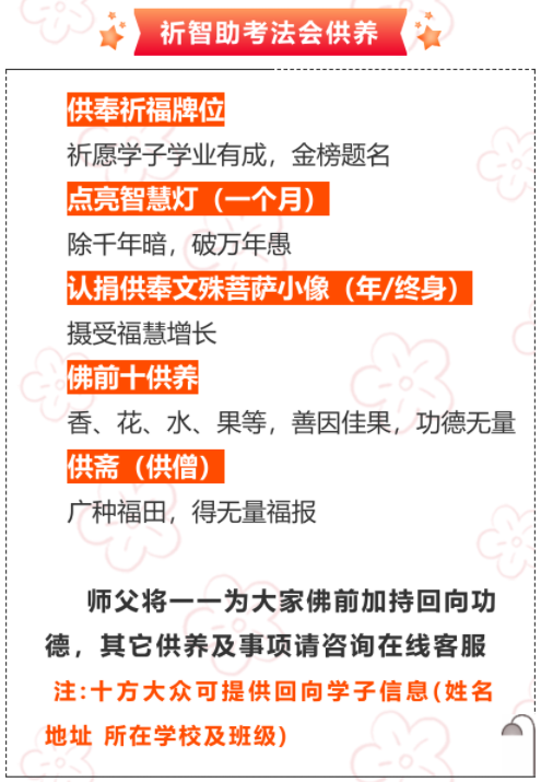 欢迎各界贤达、四众弟子、十方善信踊跃参加,同沾法喜、共沐佛光、培福增慧,共成无上菩提!愿文殊菩萨圣诞中高考祈智助考法会功德圆满!