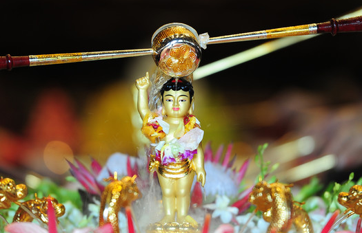 两千五百多年前,摩耶夫人诞下了悉达多太子,也就是后来出家成道的释迦牟尼佛陀。太子诞生后,一手指天,一手指地,说道:「天上天下,唯我独尊」,意思是说:「我乃是宇宙的觉者,我将广度一切沉沦生死的众生。」随后即有天雨花香、九龙吐水,从天泻下,沐浴在王子的身上。所以后世为了纪念佛陀出世,每年佛诞日便模仿九龙吐水沐浴,象征佛弟子信受佛法。