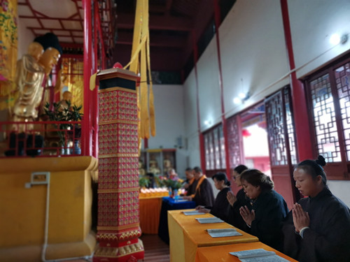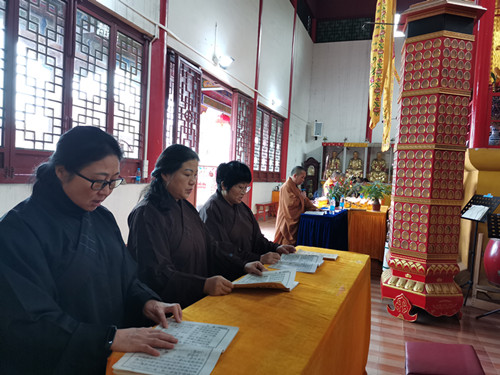 借此殊胜法缘,各位同修共同发心诵经念佛,共同忏悔今昔所造罪业,依观世音菩萨的慈悲加持,当遇到任何的困难和苦痛,才能遇难呈祥,逢凶化吉!念佛一句增福无量,礼佛一拜罪灭河沙。一声声至心诵念的观音菩萨圣号,久久回荡在大雄宝殿内…………